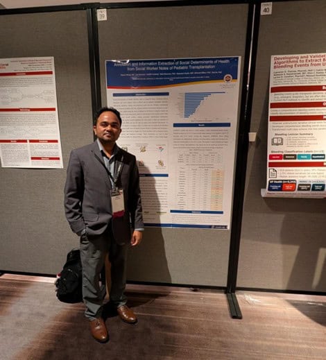 In addition to his oral presentation, Dr. Bhasuran presented a poster, “Annotation and Information Extraction of Social Determinants of Health from Social Worker Notes of Pediatric Transplantation.” The poster demonstrated new annotation schemas and NLP pipelines to identify psychosocial risk factors often buried within unstructured clinical notes—an important step toward more holistic, equitable transplant care.
