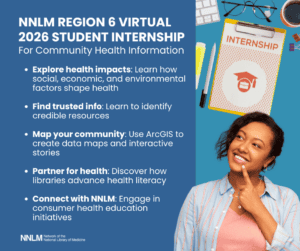 Are you a library and information science student interested in learning more about community health information outreach? Are you enrolled in a program in Illinois, Indiana, Iowa, Michigan, Minnesota, Ohio, or Wisconsin? Region 6 invites you to apply for our Spring 2026 virtual internship for Community Health Information, January 26 – April 17, 2026. This 12-week internship focuses on consumer health literacy, social determinants of health, health statistics resources, and mapping software.